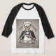 Esta é uma camiseta estilo raglan com um design gráfico humorístico. A design apresenta um esqueleto vestindo um chapéu e avental de cozinheiro, segurando uma xícara de café.