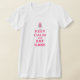 Esta camisa indica o texto "MANTEM A CALMA E COME O BOLO" na pia batismal cor-de-rosa. Acima do texto é um bolo três-estratificado cor-de-rosa. O bolo tem as fitas pretas entre as camadas, dois corações cor-de-rosa na parte superior, e está sentando-se em um suporte de prata do bolo.