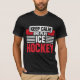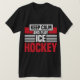 Camiseta do tema do hóquei com texto de preto, branco e vermelho que lê Mantenha Calma e Jogue Hóquei no Gelo!
