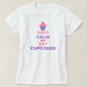 Esta camisa indica o texto "MANTEM A CALMA E COME CUPCAKES" na pia batismal cor-de-rosa e roxa. Acima do texto você verá que um cupcake cor-de-rosa e roxo com polvilha e uma cereja na parte superior.