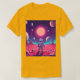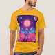 Um astronauta se posiciona sobre uma paisagem rochosa, alienígena vermelha sob um céu vibrante cheio de planetas e estrelas. A cena é surreal com um grande planeta brilhando dominando o horizonte.