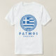 Camiseta masculina branca com design angustiado de Patmos, Grécia, apresentando a bandeira da Grécia dentro de um desenho circular de padrão de chave grega com o nome da ilha escrito em estilo grego. Esta camiseta é ideal para você usar enquanto desfruta de suas férias na bela ilha grega de Patmos. Você também pode dar isso como um presente da Grécia para quem gostar desta camiseta.