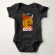 Camiseta fácil para fantasia de Halloween ou festa da colheita para o bebê. Ótimo para a festa da sua igreja! Família de abóboras fofas ao lado de uma árvore com folhas de outono laranjas em uma camiseta. Lua e nuvens brancas com uma família de abóboras de Halloween sorridentes e amigáveis com um BOO! amigável. Com olhos engraçados em cima de cada letra grande! Fundo com listras gráficas vermelhas e amarelas. meio que parece com um design de bandeira do sol japonês