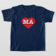 Esta t-shirt apresenta um coração vermelho vibrante contendo as MÃES em letras maiúsculas, brancas, em negrito, a abreviatura oficial de Massachusetts, o estado da baía.