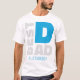 Comemorar seu pai não é apenas para Dia de os pais. Há muitas oportunidades para expressar seu amor para ele durante todo o ano. Aqui está um design "Melhor Pai" em cores azuis e prateadas brilhantes para uma camiseta branca masculina. Usamos uma fonte moderna massiva para este texto, colocamos "MELHOR" verticalmente, e usamos um "D" azul grande para o pai. Você encontrará um nome personalizável na parte inferior escrito em uma fonte azul de tendência pontilhada. Substitua o nome padrão de acordo com as suas necessidades ou sinta-se à vontade para excluí-lo.