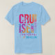 Nome personalizado e camisa de férias de cruzeiro da família de data. Design de estilo retrô brilhante e colorido com duas linhas de texto personalizado. Comemore seu próximo cruzeiro em estilo com esta t-shirt de mensagens personalizada. Perfeito para grupos. Estão disponíveis estilos iguais entre mulheres e crianças.