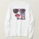 Design de pop de Trendy com óculos escuros negros, lábios vermelhos brilhantes e a frase empoderadora Girls Run The World. Um detalhe exclusivo da raposa do deserto adiciona identidade artística. Perfeito para roupa de poder feminino, presentes de declaração e estilo feminista moderno com uma estética pop vibrante.