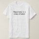 Uma design de camiseta vibrante e elevadora com a frase "Felicidade é um estado de espírito." O texto é criativamente estilizado, com uma tipografia fluida que incorpora positividade e calma. O fundo inclui elementos sutis e abstrato, como nuvens suaves e raios solares radiantes, evocando uma sensação de paz interior e alegria. Perfeito para aqueles