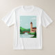 Minimalist geometric illustration depicts a pastoral landscape featuring rolling green hills and a serene river. A simple stone bridge arches over the water, leading to a tall, narrow church-like structure with a reddish-brown roof and small windows. Stylized, pointed trees dot the landscape, adding depth to the scenery. The sky is a calm blue with scattered, simplistic clouds, enhancing the tranquil atmosphere. The composition uses basic shapes and a limited color palette for a clean, modern look.