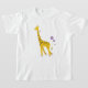 O girafa engraçado caçoa a camisa com um girafa bonito que mordisca em uma flor roxa e que guardara algumas flores com sua cauda ao patinar com skates de rolo que as rodas são feitas das flores.
