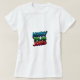A design de t-shirt apresenta a frase "Money Talks Piada" em letras a negrito e coloridas no estilo de grafite. As palavras são contra um pano de fundo caótico de notas, moedas e cartas de dólar sobrepostas. A imagem é intencionalmente desfocada para adicionar profundidade e movimento, com pouca profundidade de campo enfatizando as palavras. O design transmite uma energia divertida e vibrante, sugerindo que o dinheiro pode, às vezes, ser um assunto engraçado e inesperado.