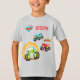 Adicione um pouco de diversão ao guarda-roupa do seu filho com esta camiseta fofa que tem três caminhões coloridos de monstros. Há um caminhão monstro verde dirigindo através de um anel de fogo, um caminhão monstro vermelho assistindo, e um caminhão monstro azul pulando sobre uma pilha de sujeira. Há também bandeiras de corridas controladas no canto superior esquerdo e o nome do seu filho no canto superior direito. Esta camisa é um presente personalizado divertido para qualquer criança que ama caminhões monstros e é perfeita para aniversários e feriados.