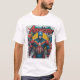 A design de camiseta apresenta um personagem de desenho animado dinâmico, posicionado entre símbolos de poder e justiça, como escudos, raios e estrelas. O texto "Montagem de Vingadores" é escrito em estilo de grafite, energia radiante e entusiasmo. A design geral transmite um sentido de unidade, força e espírito super-heroico.