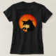 Gato preto assustador com olhos laranja na frente de uma lua grande, cheio, laranja.