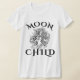 A camiseta apresenta uma design gráfica em preto e branco de uma feminina divina com uma coroa floral, enfeitada com flores e o texto 'MOONCHILD' em estilo místico e etéreo. Abrace a energia feminina divina.