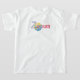 Zoe SINGS para Wagner! A obra de arte original de ZoeSPEAK sobre esta camiseta apresenta um retrato do compositor Richard Wagner, vestindo uma boina, em um quadro de ornamentado de ouro. O retrato pende sobre um fundo amarelo de papel de parede com listras e bandas de tomate vermelho. Uma foto de Zoe o Cachorro Bilíngue está em frente ao retrato. O texto diz Muito Wagner, em inglês e francês.