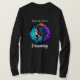 Mulher bonito com arte azul, turquesa, azul, amarela e vermelha colorida ai feita em um vibrador eetéreo místico. Citação inspiradora, "Nunca Pare de Sonhar."