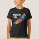 Este design vibrante apresenta uma imagem gráfica colorida do teclado, esparramada na camisa com as palavras "Rock On" em texto em negrito. É uma escolha excelente para músicos, teclado, concertos ou qualquer pessoa que goste de música. Você pode alterar o texto, se quiser, selecionando o botão "Personalizar" e inserindo o texto no modelo de design. Gráfico de teclado obtido por cortesia da conta premium do designer com vecteezy.com.