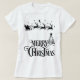 Celebre o espírito do Natal com esta t-shirt única! Apresenta um clássico design com Papai Noel galopando sua carruagem movida por renas através de um céu decorado com estrelas e a lua, enquanto embaixo apresenta uma bela árvore de Natal e a frase "Feliz Natal" em caracteres elegantes e atraentes. Esta camiseta distintiva será uma adição perfeita às suas comemorações de inverno e fará você se sentir quente e alegre nesta estação especial.