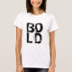 A camiseta recortada mostra um design de tipografia preto em preto-e-branco.