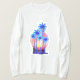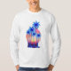 A design de camiseta apresenta uma imagem vibrante e futurista: palmeiras-néon silhuetadas contra um sol, com um padrão de grade sobre a cena. Esta design combina elementos do paraíso tropical com um toque de estética ciberpunk, criando um visual único e atraente.