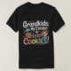 Este design apresenta uma camiseta preta com a palavra "Netos" no topo em branco. Abaixo, "Netos", encontra-se o texto "A minha desculpa", em branco, por cima de "para", em amarelo, e "Extra", em cor-de-rosa. Abaixo de "Extra" está a palavra "COOKIES!" em uma fonte grande e estilizada com cores alternadas de rosa, amarelo, verde e laranja. A design inclui um gráfico de um pote cheio de biscoitos e uma moça de desenho animado.