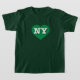 Esta camiseta apresenta um coração verde vibrante contendo as letras maiúsculas, brancas, em negrito, NY, a abreviação oficial de Nova York, o estado do império.
