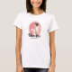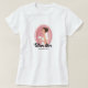 Anuncie os vossos núpcias com esta design de camiseta branca. O texto diz: "A futura Sra. com o seu nome por baixo. Uma ilustração de uma noiva sorridente segurando um buquê de flores em seu vestido branco rico e vestindo um véu. Defina dentro um quadro oval cor-de-rosa com uma borda dimensionada.