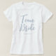 Celebre sua Equipe da Noiva com estilo com esta camiseta de casamento personalizada e elegante! Com a frase "Equipe da Noiva" em uma fonte de letra cursiva elegante, este modelo pode ser personalizado com um nome, data de casamento, local ou qualquer texto que você escolher. Perfeito para despedidas de solteira, chá de panela, presente para as damas de honra ou um fim de semana de casamento divertido — é um presente atencioso e elegante que sua equipe vai adorar! Cores impressas: azul poeira em branco.