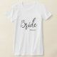A camiseta feminina é mostrada em um estilo de gola redonda e mangas curtas em branco com texto preto: Noiva e um nome de amostra personalizado.