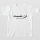 Frase que descreve "nós não seremos silenciosos" em inglês e árabe, relativo ao incidente em que Raed Jarrar, que embarcava um vôo nacional, foi pedido para mudar seu t-shirt porque retratou o texto árabe. A divisa é inspirada pelo nicht alemão do schweigen de Wir da frase ("nós não seremos silenciosos"), o slogan do rosa branco, o movimento alemão subversivo do antifascist.