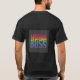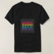 A t-shirt apresenta o texto "Nostalgic Bliss" numa paleta de cores vibrante do pôr do sol. Cada palavra é um tom diferente de laranja, rosa e roxo, evocando um sentimento de nostalgia quente.