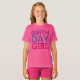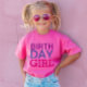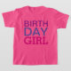 A camisa personalizada "Birthday Girl" apresenta design de texto moderno em tons de rosa quente, azul e roxo. Personalize o texto com o número de idade do seu filho no verso. As cores podem ser personalizadas.