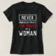 Nunca subestime o poder de uma mulher. Este poderoso slogan está em letras brancas maiúsculas, com as palavras "o poder" em vermelho, em uma camiseta preta. Foi feito para apoiar as mulheres em todos os lugares.