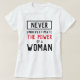 Nunca subestime o poder de uma mulher. Este poderoso slogan está em letras maiúsculas negras, com as palavras "o poder" em vermelho, numa camiseta preta e branca. Foi feito para apoiar as mulheres em todos os lugares.