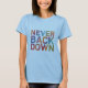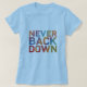O design t-shirt apresenta o texto "Nunca recuar" num design a cores múltiplas e a negrito. Cada palavra poderia ser uma cor diferente, criando uma exibição dinâmica e atraente de resiliência. A própria fonte pode ser forte e ligeiramente angular, enfatizando o espírito determinado da mensagem. Lembre-se, não há pessoas incluídas nesta design.