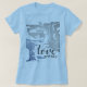 A mensagem positiva "O amor funciona" sobrepõe-se a um design batik, contemporâneo, em cinzas prateadas e azul ardente que lembra a brisa marinha e a serenidade das ilhas. Foto aqui em uma t-shirt azul clara, há uma variedade de cores e estilos de camisa disponíveis.