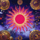 "Fogo Dançante do Cosmos" O Sol. As espirais hipnóticas e as explosões de ouro do Sol dão a ilusão do movimento, como se as chamas solares estivessem vivas. Uma intrincada obra-prima celebrando energia, calor e equilíbrio celeste com cores vermelha, laranja, amarela e azul.