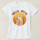 Design de gato com as palavras "Olá, Gatinho!" Gato a rir com sol retrô no fundo.