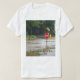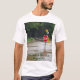 T-shirt com um sinal da parada acima da água na avenida do olmo. & rio Rd. Bogotá NJ