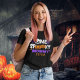 Diseño divertido para familias de Halloween, con colores purpura y naranja con la "Frase ONE SPOOKY MOMMY" con el nombre de mama personalizable y con imagenes de calabazas y murcielagos y esqueletos de halloween. Este diseño es ideal para fiestas familiares de halloween o simplemente para lucir genial en las fiestas de Halloween. No lo piense y adquiera las suyas ahora