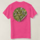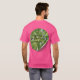 Roze T-Shirt, unisex met op de voorkant het logo van het Vishnuh-Genootschap met op de achterkant een afveelding van bomen en een opschrift. We are a manifestation of nature. om ons eraan te herinneren dat we een onderdeel zijn van de natuur en er niet boven staan.