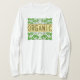 Orgânico: um slogan verde para jardineiros, cozinheiros e comemorações do Dia da Terra, em letras decoradas em maiúsculas contra um fundo de bolota e folhas de carvalho, cercadas por folhas de rolagem.