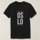 Bold vertical Oslo wordmark on black with a red top bar and blue bottom stripe; high-contrast Nordic urban vibe, ideal for streetwear and poster tees targeting design lovers.