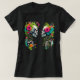 Dois perfis de crânio estilizados são apresentados sobre um fundo branco plano. Cada crânio é rodeado por flores e folhagem vibrantes e coloridas, criando uma coroa decorativa e quase floral ao redor de cada cabeça. As flores são uma mistura de fúcsia, rosa, laranja, amarelo, lacre e outras cores brilhantes. As folhas e as videiras são pintadas em tons de verde, imitando um crescimento natural.