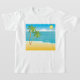 Uma vista cênica de uma praia de palmeiras com um sol brilhante. Esta design parece realmente eficaz nesta camiseta