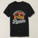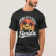 Esta t-shirt preta apresenta um gráfico retrô-estilo para "PANAMA CITY BEACH" arquivado no topo e "Florida" numa letra de script na parte inferior. A imagem central mostra um pôr do sol sobre o oceano com silhuetas de palmeiras, cadeiras de praia sob um guarda-chuva e uma prancha de surfe. A paleta de cores inclui laranjas, amarelos e uma dica de azul.