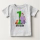 Esta adorável camiseta do bebê apresenta uma design com um elefante roxo com um macaco e um passarinho, e um pequeno tigre de bebê com um grande, verde número um. Personalize esta t-shirt com o nome da sua escolha.