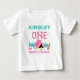 Camiseta de aniversário de um ano com tema de acampamento colorido para meninas, apresentando uma grande palavra multicolorida, tenda rosa, fogueira, placa e mais. Ideal para uma festa de aniversário de um ano com tema de acampamento para uma bebê menina.