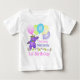 Uma linda princesa de ursinho roxo saltando entre flores bonito, rosa e amarelas, com 5 balões pastel anunciando sua festa de primeiro aniversario na camisa. Este urso delicioso tem uma coroa amarela joalhada. Ela está vestida de delicados acessórios de flores. Personalize com o nome da sua pequena princesa. Design original do Anura Design Studio.